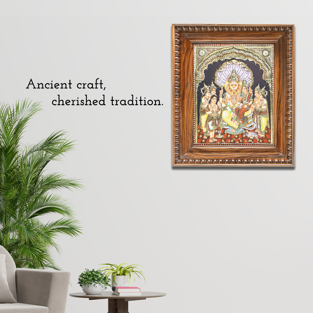 Narasimha is one of the ten avatars of the Supreme Lord Vishnu. Goddess Lakshmi is the consort of the God Narasimha, so she is sitting on the lap of Narasimha. As per hindu mythology, Hiranyakashipu was an asura king. He took a strong penance against lord shiva for deathless life in all three worlds. Later Hiranyakashipu acquired all three worlds and troubled the devotees of lord Vishnu. He dominated everyone and started saying that he had no equals. To conquer this demon, Lord Vishnu manifested himself as Narasimha and killed him by sitting at the threshold.